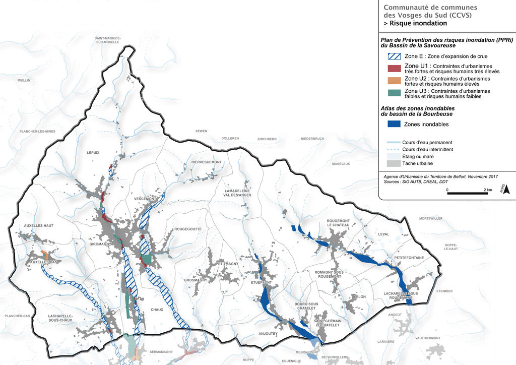 Un atlas des zones inondables (AZI) existe actuellement sur les communes d’Étueffont, Anjoutey, Bourg-sous-Châtelet, Lachapelle-sous-Rougemont, Leval, Petitefontaine et Rougemont-le-Château. L’AZI est un outil de connaissance de l’aléa inondation, sans caractère réglementaire.