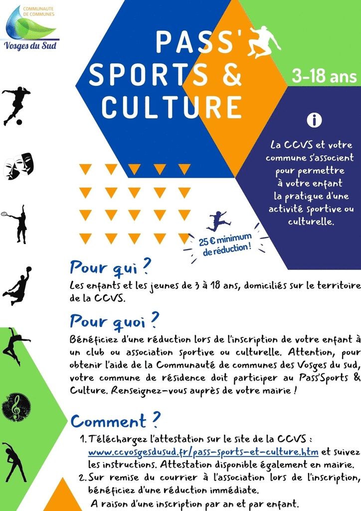 Le Pass'Sports & Culture c'est une aide financière de la communauté de communes et de votre commune pour l'inscription de votre (vos) enfant(s) auprès d'une association, d'un organisme culturel et sportif.