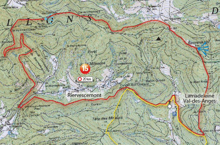 Intérêt : très belle randonnée au dessus des vallées de Lamadeleine et de Riervescemont ; ruines du château du Rosemont ; chapelle de Lamadeleine ; point de vue exceptionnel depuis le sommet du Baerenkopf (1074m)