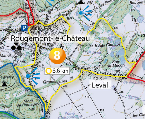 Intérêt : Les villages de Rougemont et Leval, l'église de Rougemont, la vue sur les Vosges, le château et le parcours botanique