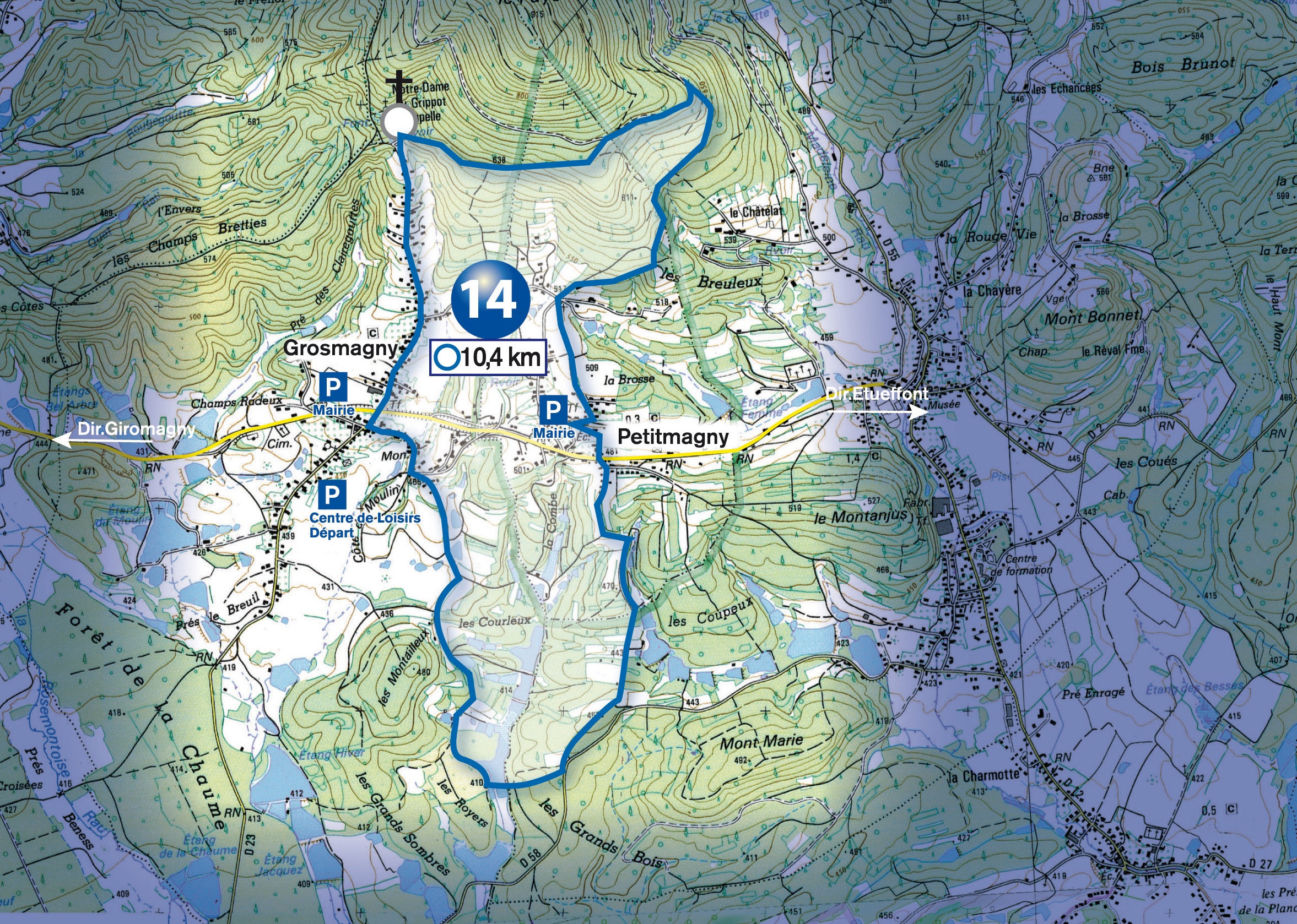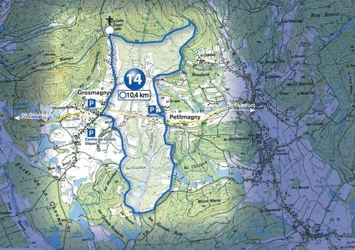Intérêt : église de Grosmagny, Monument Miclo, belle vue sur la Trouée de Belfort ; chapelle du Grippot ; village de Petitmagny ; la forêt et les étangs.