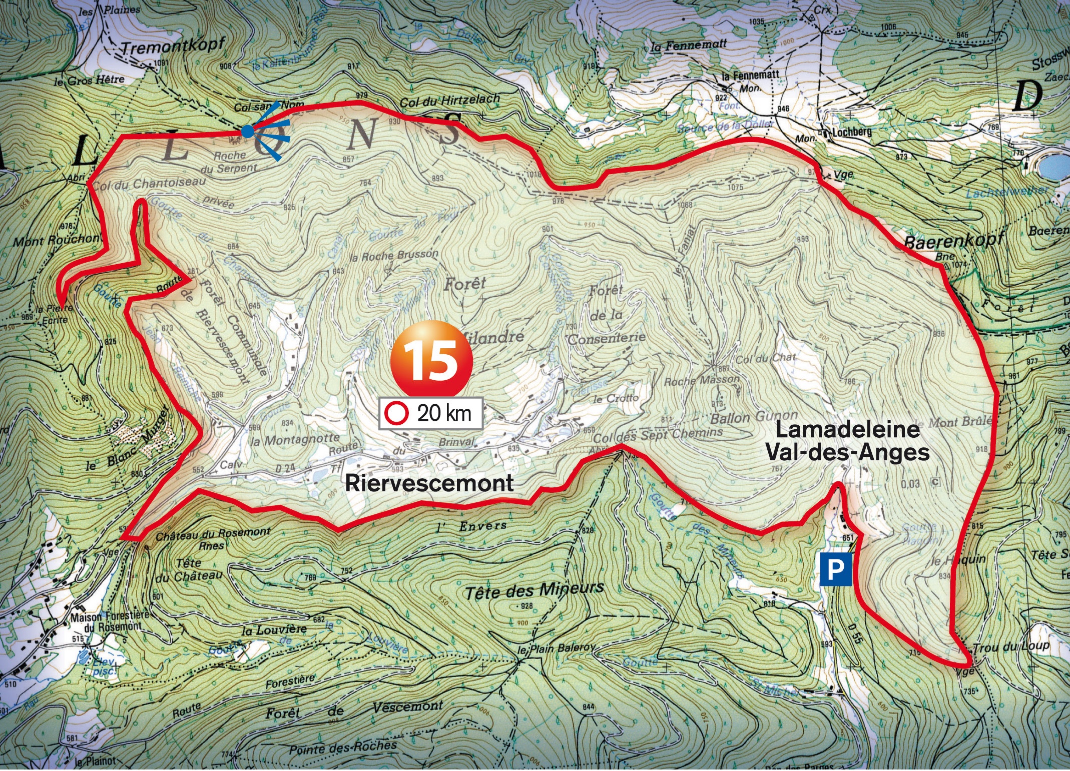 Intérêt : très belle randonnée au dessus des vallées de Lamadeleine et de Riervescemont ; ruines du château du Rosemont ; chapelle de Lamadeleine ; point de vue exceptionnel depuis le sommet du Baerenkopf (1074m)
